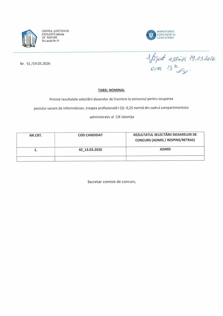 Rezultatul dosarelor de înscriere la concursul de informatician